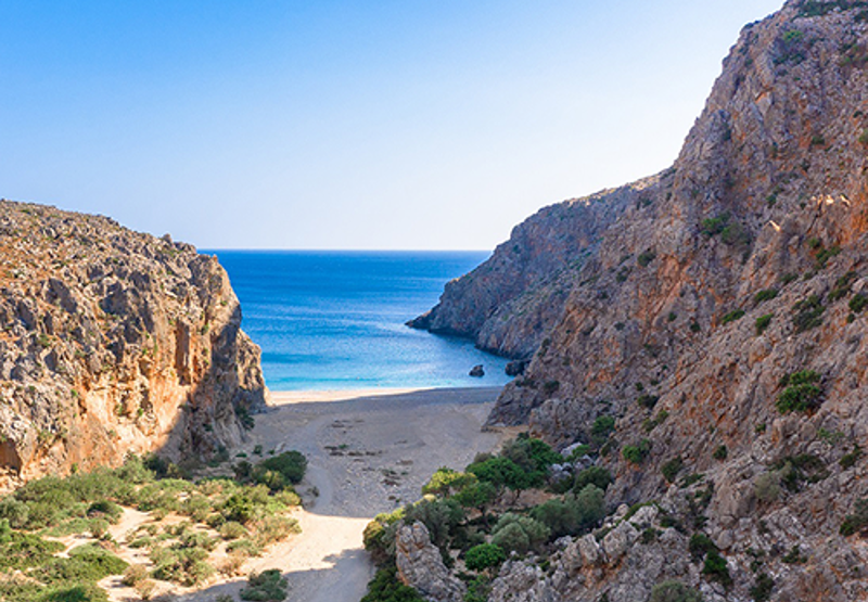 And then comes the reward: the gorge opens up to a secluded beach, where the Libyan Sea stretches out in front of you. No umbrellas, no beach bars, just pebbles, clear water, and the feeling that you’ve earned this moment.
