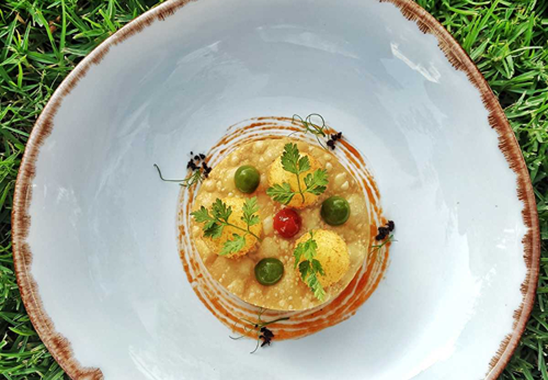 - Village-style pastry & assembly: Cut the pastry into round or square shapes and fry. Serve in layers with the greens, topped with the fritters, tomato jam and courgette purée.